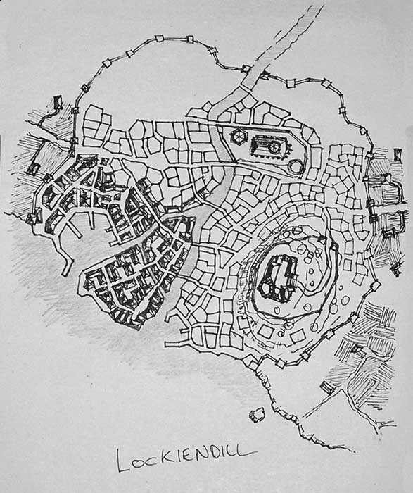 Lockiendill e` una citta` fortificata sul fiume che sfocia in mare, con il palazzo ducale al di la` del fiume. Simbolo: 2 fenici d'argento su sfondo azzurro (colori argento e azzurro). Edifici notevoli: una piazza con duomo, battistero e torre bianchissime (come Pisa). Locanda alla Luna Tagliente, con sauna e casino`.