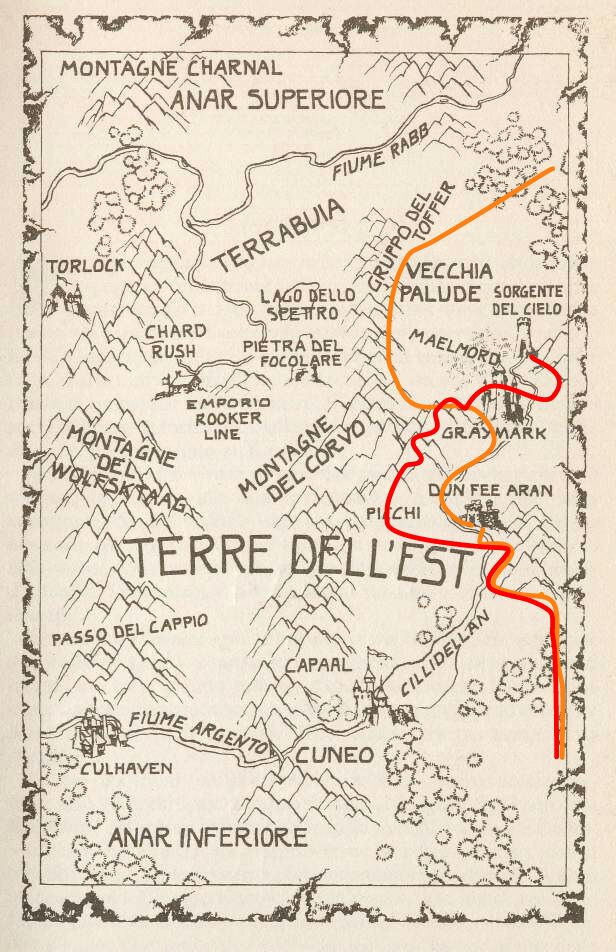I PG arrivano a Terrabuia e iniziano a costeggiare il fiume Raab per evitare spiacevoli incontri. Qui decidono di seguire una specie di muro semisotterrato nel terreno e la scelta si rivela ottima perché quello strano muro fatto di una pietra friabile da cui spuntano dei ferri conduce quasi ogni giornata di cammino a un piccolo riparo semisommerso nella terra anche quello ma usabile dai PG. Così facendo riescono a evitare le creature pericolose di Terrabuia e le bande di troll che girano in cerca di prede. Il tempo qui sembra essere differente perché l'inverno è arrivato senza una grande quantità di neve come se il calore emanato dal terreno tenesse lontano il maltempo, anche se la nebbia persistente e la poca vegetazione rendono la terra altamente inospitale.